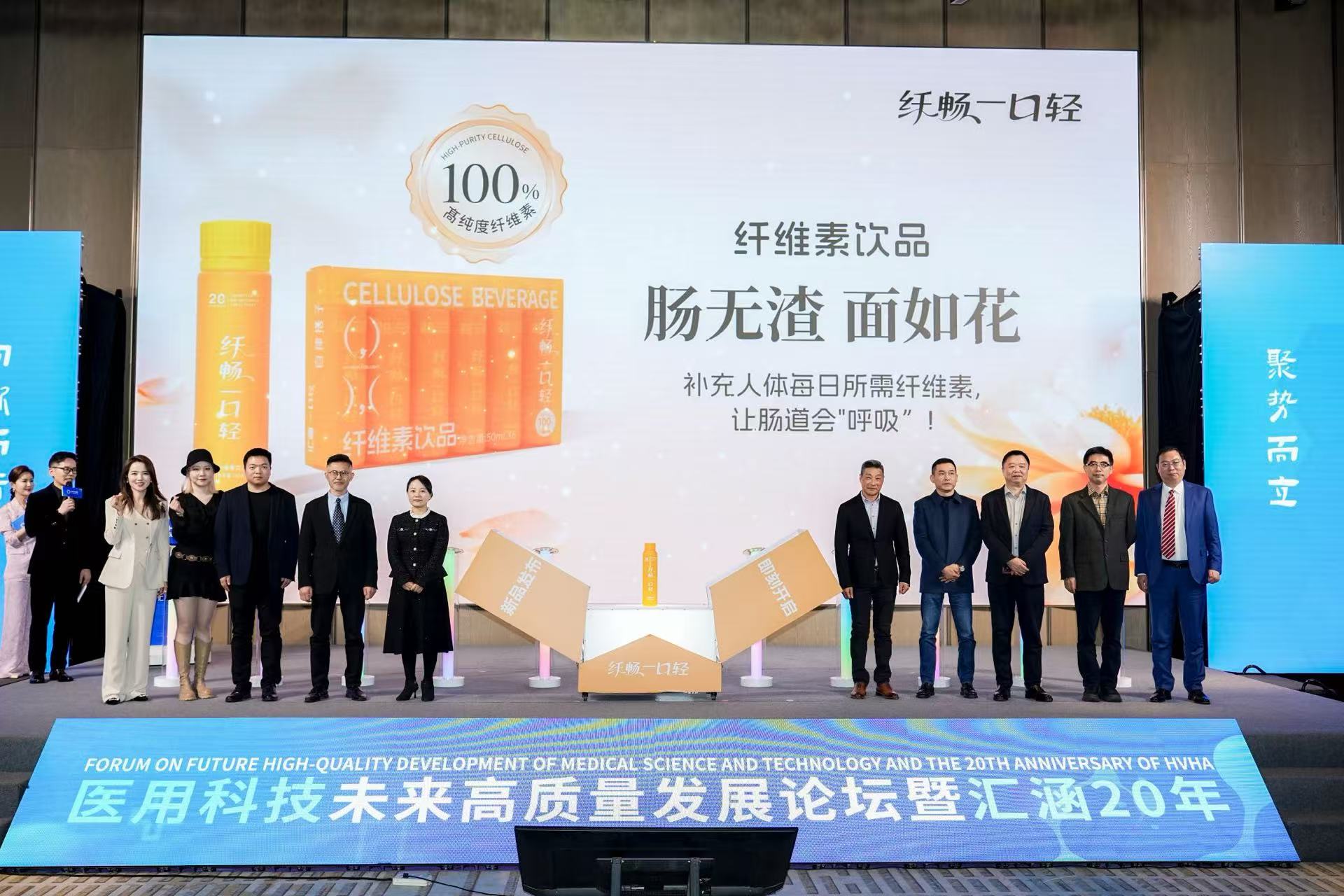 在研发成果分享环节,于奎博士带来《生物发酵纤维素技术》专题分享,全方位展现企业在核心技术攻关中的硬核实力。紧随其后,汇涵一口轻新品发布启动仪式盛大举行,嘉宾共同登台见证这一重磅时刻!作为汇涵依托20年生物材料研发技术打造的生物发酵纤维饮品,一口轻以100%高纯度发酵纤维为核心,核心成分与高端医用材料同源,打造0卡0糖0脂肪0蛋白质0碳水0钠的无负担配方,凭借物理轻排、清养合一的特性,为肠道健康提供全新解决方案,其成功推出是企业从医用科技向大健康领域“向新而行”的重要成果,实现技术创新与民生需求的精准对接,更拓展了“聚势”后的产业新赛道。